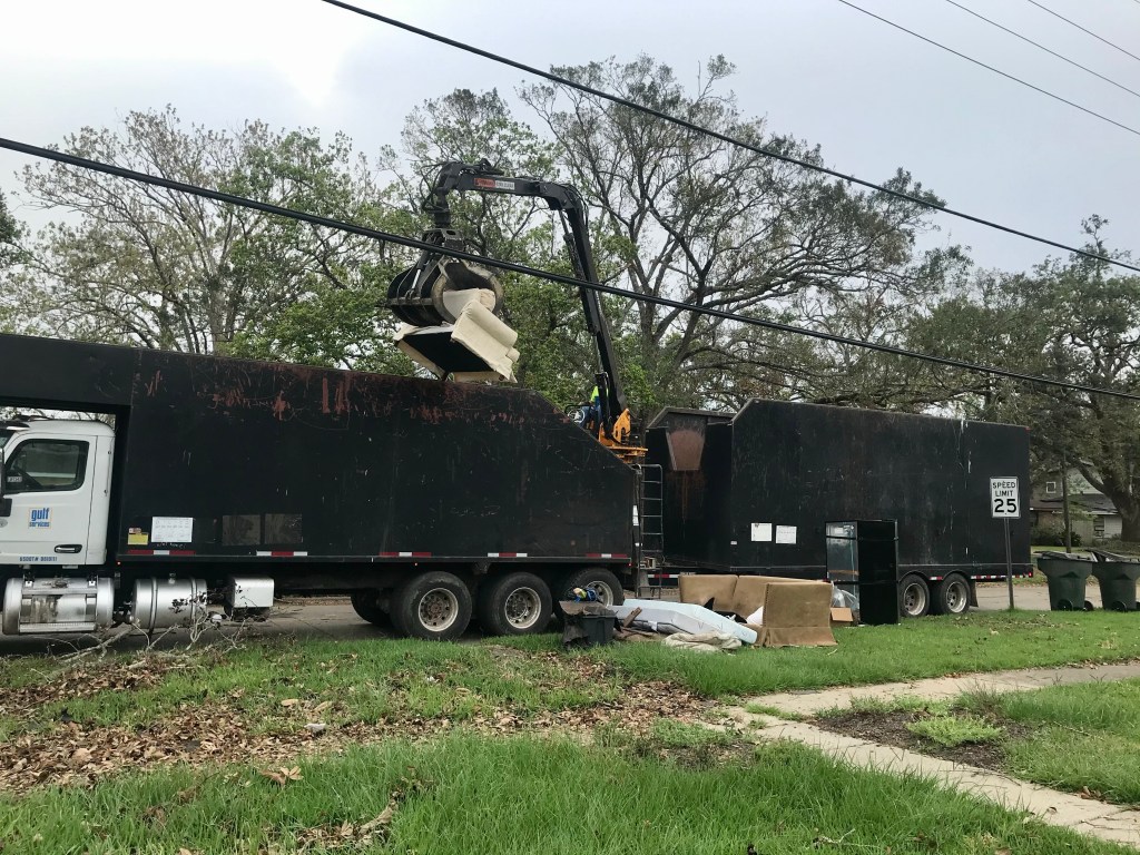 The massive debris trucks have been here since the first storm. I assume they evacuated for the second storm in what must’ve looked like a parade of sorts and then meandered slowly back only to find that the first hauls from the first storm were replaced by second hauls from, well, you get it. My favorite saying from local officials prior to Delta was, “Secure your debris.” Ha! We’re known down here for our family-friendly Mardi Gras so it’s been mentioned a time or two that perhaps we should invite these fellas and gals back to be grand marshals if we get to have a post-COVID carnivale. They can throw instead of collect next time! If you’ve never seen them, they’re impressive enough to bow down or curtsy if you’re inclined. Between two massive dumpster-like bins is a chair and arm like the claw game from a pizza parlor. They’re followed by a guide that must be like security and sometimes a couple of jesters sweeping up the rear.