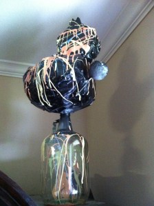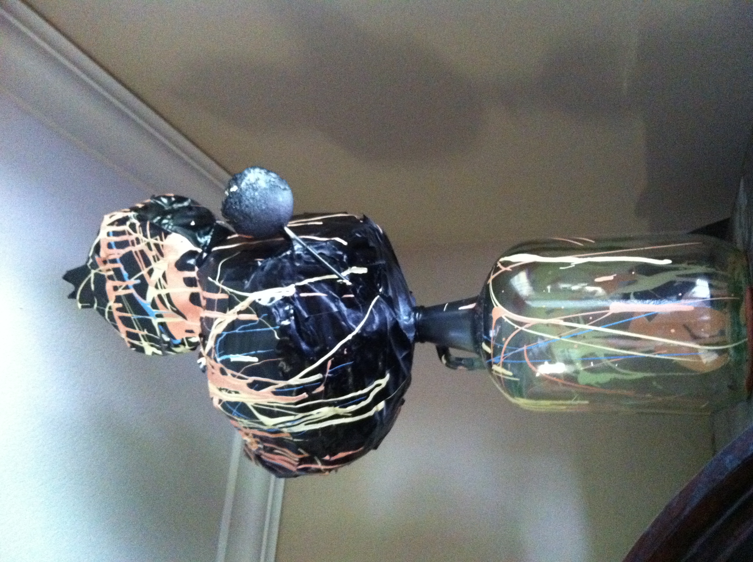 The big piece I had been dying to see was a large chess piece sculpture created from a glass jug, paper mache, plastic plates, styrofoam balls, and of course paint. Someone drank A LOT of wine to have emptied those jugs, yet I had not even been called. I would have volunteered my services for such a worthy cause if only I’d been asked. The day she came home and described to me her theme for this series was a proud one. She envisioned a series of chess pieces created around insects. Her first inspiration was “To be… a bee” and it was not a question. A queen bee represented her personality well and would not be too difficult or time-consuming to create in the amount of studio time she had alloted. Her second idea? A spider as a king piece. Why? Because it might easily freak out her brother should she sneak it into his bedroom in the middle of the night. Her third and final vision was my favorite though admittedly would have been difficult to construct. This masterpiece was conceived around the bishop figure for her class’s game board, and when she asked me to guess what insect would represent this piece, she folded her hands together and bowed her head. A PRAYING MANTIS was to serve as the bishop. That’s MY girl!! Take a bow, Honey! You have come a long way from the little thumbprint butterflies you made for me and have left a print on my soul that is as unique and individual as your creations.