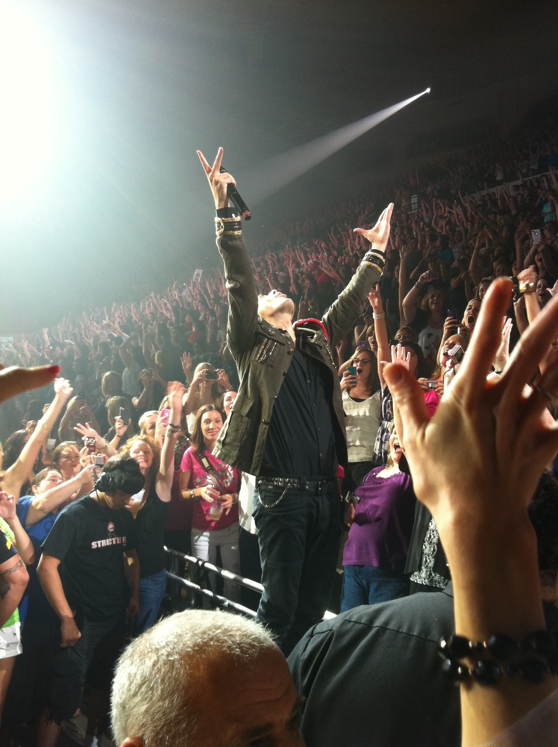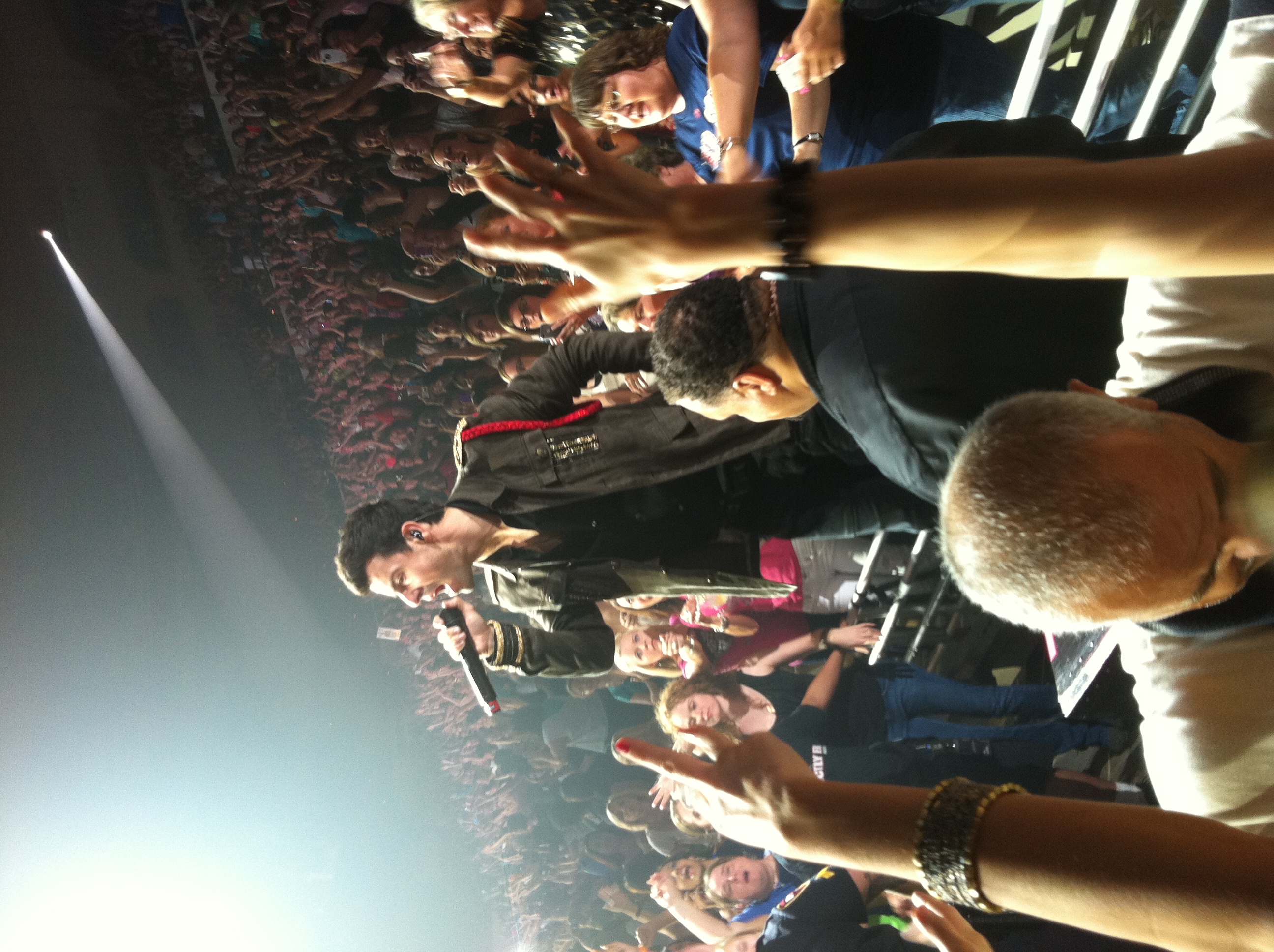 It took only half a nanosecond for us to pounce. Little was the first I saw out of the gates because by the time I looked, Middle was nowhere to be seen. I think they both may have taken out a couple of Pregos in their mad dash. I was a bit more suave and arrived at The Kid a few seconds behind. The rest was total chaos so all I could do was document the scene with my trusty iPhone by holding it into the air and thinking maybe I’ll get some decent shots this way. We watched our boy sing directly to us (and maybe some other thousands of fans as well, but they are not important here) and headed starry-eyed by to our seats. THAT is when the dispute began. You remember the Movie, JFK? Yeah, well the conspiracy theorists could have a field day with this one, and I have grainy documented proof from the grassy knoll that supports my version of events here. Little arrived back at her seat BRAGGING (which is a mortal sin in our house) that JORDAN had grabbed HER hand and refused to let go until security ushered him along. Oh, REALLY? Allow me to submit my evidence for the record.